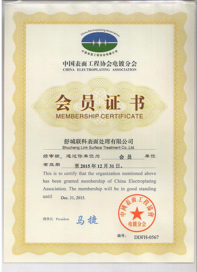 2014年5月,舒城聯(lián)科表面處理有限公司正式成為中國(guó)表面工程協(xié)會(huì)電鍍分會(huì)會(huì)員單位。
